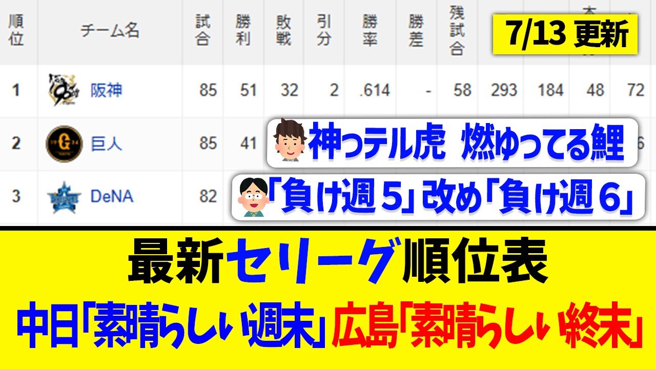 【7月13日】最新セリーグ順位表 ~中日「素晴らしい週末」広島「素晴らしい終末」~