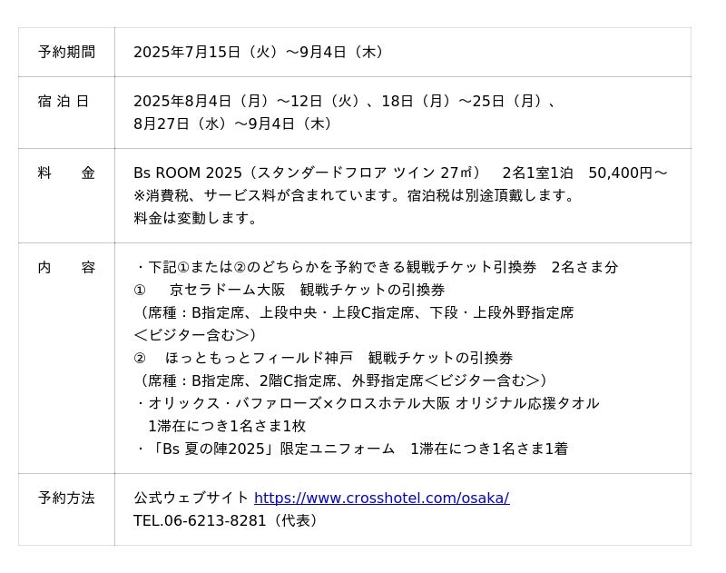 クロスホテル大阪(所在地:大阪市中央区、総支配人:水谷 之則)は、オリックス・バファローズの夏の恒例イベント「Bs夏の陣2025」の限定ユニフォームと観戦チケット引換券がついた宿泊プランを本日よりホテル公式ウェブサイト(https://cross-osaka.orixhotelsandresorts.com/plan/7753/)にて販売します。