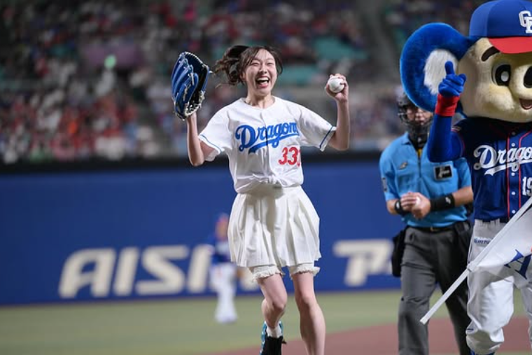画像には、中日ドラゴンズのユニフォーム(背番号33)を着て始球式を終えた直後のマウンド上で、ボールとグローブを手に満面の笑みでガッツポーズをする姿が収められている。