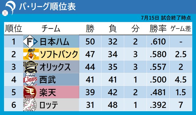 【パ・リーグ順位表】ソフトバンクが逆転勝利で首位・日本ハムに「2.5」差 楽天が4時間半超えの熱戦を制す(日テレNEWS NNN) – Yahoo!ニュース  Yahoo!ニュース【プロ野球結果】ソフトバンク快勝 日本ハムとゲーム差縮める  nhk.or.jp山本、逆方向へプロ1号 2度目の昇格で結果―プロ野球・ソフトバンク  時事ドットコム「怪我をすればそこまで」 8点差の2死に横っ飛び…牧原大成の矜持「なくなれば終わり」  鷹フルソ10―ロ2 ソフトバンクの山本恵大がプロ初本塁打の逆転3ラン ロッテは投手陣崩れる  産経ニュース