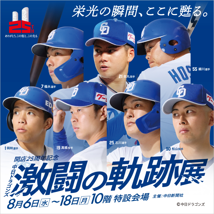 ジェイアール名古屋タカシマヤ(愛知県名古屋市中村区名駅1-1-4)は、「開店25周年記念 中日ドラゴンズ 激闘の軌跡展」を10階特設会場で8月6日~18日に実施する。