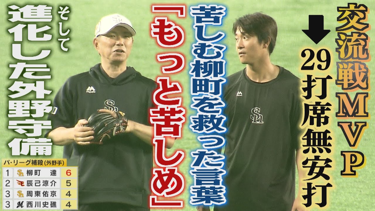 スポーツキューブTNC 野球解説者の池田さん、そしてスポーツジャーナリストの小鉄さんとお伝えします。よろしくお願いします。 よろしくお願いします。お願いします。 よろしくお願いします。 現在打率ランキングでリーグ 4位。得典拳打率は 2位。出塁率はリーグトップの柳町達る。 今の活躍からは想像できませんが、開幕は 2軍スタート。交流戦では脅威の打率3割 9分7輪、出塁率4割7分4輪と12球団 トップの成績で交流戦MVP プロ6年目で初のタイトルをゲットです。 プロ野球生活の中でのタイトルというのが初めてなので、ちょっと出きすぎくらいのはい。いい成績かなと思います。 そんな出来過ぎ君。いえいや柳町ですがリーグ戦再開後 6試合ヒットなしと苦しみました。 すごく悩みながら、もう色々試しながらも全然うまくいかなくなって本当にどうすればいいのか本当に迷っていた 30打席だったかなと思います。 しかし自らの力で調子を取り戻すと今週は完全復活。先日初のオールスター出場も決まりました。 主力の離脱が続く中、低位置を掴み取り、 実力人気に評価も急上昇。プロ6年目 ブレイク中のタルを鹿さんが直撃です。 主力離脱が相つぐホークスの中で光る活躍 を見せている柳町達。 交流戦で打率3割9分7人。率4割7分4 輪と圧倒的打撃成績を残し 初の交流戦MVPに輝きましたが リーグ戦再開後は急失失速 29打席ノーヒットという苦しい時期も ありました。 交流MVPを取ってま本当 おめでとうございました。はい。 ただその後ちょっと30打席ですか はい。 苦しい時間がありましたけど、ま、そこの時間、ま、どういう気持ちでいいましたか? そうですね、もう本当になかなかヒットが出ないモヤモヤとすごく悩みながら、もう色々試しながらも全然うまくいかなくなって本当にどうすればいいのか本当に迷っていた。 半重打席だったかなと思います。 校長の交流戦から 1 点。開音が聞かれなくなった間、国監督とこんなやり取りがあったそうです。 ま、もっと苦しめっていう 言葉め はい。 自分自身と向き合って助言とかこう聞きたくなるところを抑えて自分自身の中でこうこれだっていう答えを見つけろっていう言葉をいて うん 自分で乗り越えてやるっていう思いにさせてくれたかなと思います分析してもらうと今なぜ打てなくなったかですよねボールを見よう見ようとしすぎて 中に入れすぎて ボールに反応できなくなったそれが1 番の要だったかなと思 難しいとこですよね。今年を見てて何が違うと僕は率の高さ はい。 というのはホォアボールの選び方っていうのが非常にすごいな変化したなと思ったんですよ。 でも悪い時はその自分の長所になってきた ものが自分を苦しめると 地下さんが指摘する柳町の出塁率の高さ。 ヒットでの出塁はもちろんですがフォア ボールの数も現在リーグ2位。 しっかりボールの見極めができていると言えますが、 見すぎてダメになっていくというその辺のその自分のそのなんですけど、どうやって消化していったのかなと思うんですけど、 やっぱりいい時は こう打ちに行きながらボール玉を振らないっていううん。うん。 もう見て見てボール振らないじゃなくて、もうちゃんと打ちに行った中で見逃すっていうことができてた中でやっぱりこうボール見を見ようとしすぎた結果こう慌てて手を出すっていうそこがちょっと うまくできてなかったなと ボールの見極め長くボールを見ることではなくに行く体勢の中で見極めてい そのわずかないで空振りや振り遅れボールに対応できなかったと自ら分析できています。 ま、3番っていう場所でいて 打たなきゃいけないっていう思いもありながらで、その中でしっかりコンタクトしようとした結果、こうボールを見て見てっていう形になってご手ごテに回ってたかなっては思いますね。 30打席ぶりにヒットが出た 4日のゲームでは打順は 3番から6番に 1塁ベース上では笑顔がこぼれました。 君のあの1塁での表情で はい。 このモヤモヤが抜けたのが分かったよ。 そうですね。なんかもうほっとしました。本当に。はい。 苦しい時期もね、こう乗り越えながら、ま、そこで、え、自分のベストヒットっていうのはどうでしょう? ベストヒットですか?な んだろうな。 あら、悩む。 やっぱこう谷投のオリックス戦のホームランが はい。1番 ホームランっていうのはすごくやっぱ手応えのある打席が多いんで、 その今3 本打ってる中で選びました。はい。 え、やっぱり2 桁にはホームラン乗せたいですか? そうですね。はい。もうね、て、 はい。やっぱり外野手なんでそれくらい打ったらはい。 やっぱ打たないといけないかなと思ってます。 地下さんが感じた柳のもう 1 つの変化が守備。柳田正が怪我で離脱している中、ガイアの守備でも光っています。 ボールにやっぱり直線的にこう入っていくのがすごくうまくなったなとすごく感じてるんですがどうでしょうか? はい。 やっぱり守備はあんまりこう得意じゃないと言いますか