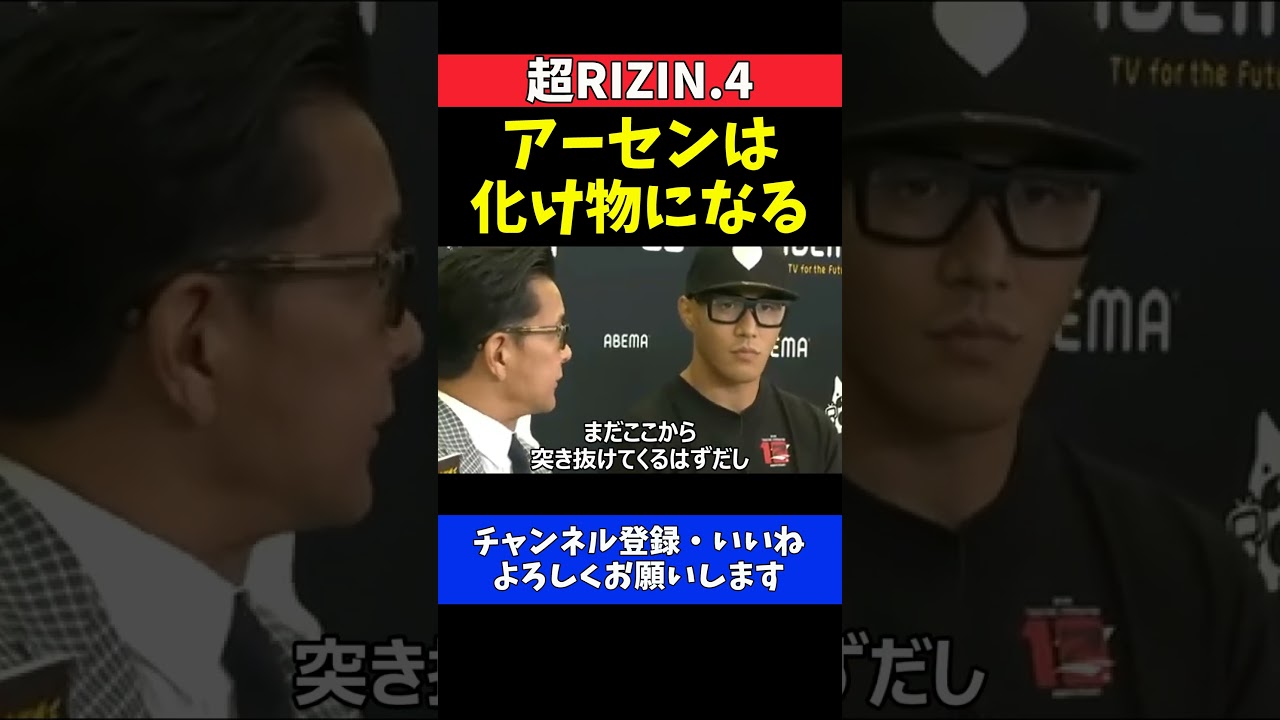 「超RIZIN.4」でフライ級GPに出場する山本アーセンについて、榊原CEOがその潜在能力を高く評価しました。榊原CEOはアーセンについて「クロン戦から気付けば10年。でもまだピークは来ていない。DNAも含めて磨ききったら化け物」と絶賛。この言葉を受けたアーセンは、「最近あまりにも調子がよすぎちゃって、“俺いける”って心の底から思ってる」と、自信をのぞかせました。