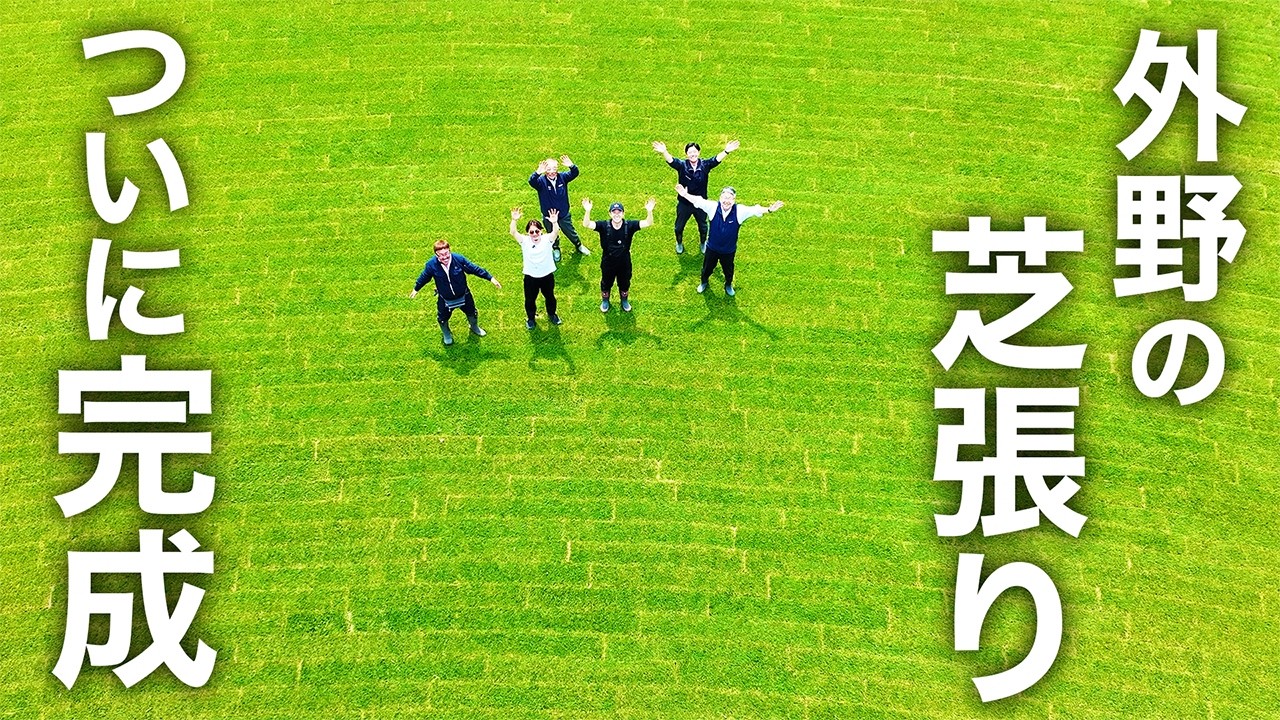 [音楽] もうこれすごくないですか?景色がっと変わりましたね。 緑 見てください皆さん。もう芝が外野に貼られるだけでこんなに青しくなるっていう すごい。 もうこれぞっぱスタジアムのね、ロケーションというか。いや、すごいない間に 足本さんが ね2週間でやっていただいてやってくれて お疲す。 あ、お疲れ様です。 お疲れ様です。 だいぶもう綺麗に貼られてます。 まですね。 はい。 頑張ってます。 ロケーションがもうすごく良くて最高ですね。 天気いですか? 緑がでも雨があんま降なかったんですよね。 降らなかったですね。1 回だけですね。1 回だけですから。2週間で1回だけです。 日曜日に降っただけ。 あ、マジですか?じゃあやっぱり水が ずっと水やってます。 そうすよね。 永遠にやってます ね。そういうことみたいな。 はい。 [音楽] もうでもあとちょっとっすね、本当に。さん はい。 ね、 もう少しです。 すごい いいな。こんなとこでプレイしてみたかったな。 ねえ、 思いません。 これさ、本当やっぱりね、芝合わるしかね、 運動ができるって 贅沢っすよね。 確かに 僕さ、最初ここ来た時海外と思いましたもん。 ああ、なるほど。 あのフェンスのあの色とかもやっぱりちょっと日本にない色というか。 [音楽] うん。 で、この芝とこのコントラストであれ、ここってアメリカって思いますもんね。 確かに。 なんかこうやって出来上がりの姿を想像しながらし植えられると本当に幸せですよね。 確かに。 社長これどうしたらいいの?こう合わない時 合わない時なきゃなんですよね。 無理やり。 これで会います。 無理やり。 無理やりって言葉やめてるね。 う さん無理やりですか? 自然に な染ませ。 な染ませよね。 ここ左側が前回最長さんが最初に貼った。だいぶもう寝ずいてる感じあります。 成長度。 あ、本当だ。本当だ。 伸びてますよ。 高さが違うんだ。 もう成長しちゃってるんだ。2 週間でこんだけ伸びる。 縛って早いっすね。やっぱり成長が もう早ないですか?ほら張ってますよね。 本ん当すね。はい。 結構もう、あ、でももうほら根っこが土に 大丈夫? あのね付いてきてる感じが ねいてます。 あ、よかった。あります。 さすが、 これすごいっすね え。これカットしてこう入れる感じですよね。 そうですね。 これまた頭使えますね。これ かね。 ねえ、 中斎藤さん、あの、外側から はい。はい。50 枚はい。 で、こう合わして なるほど。 で、中からずっと同じく貼るとこういう隙間ができ、 そういうルールがあるんですか? いや、あの、R が違うじゃないですか。さ、 だからこう貼ってくるとどうしてもそうな し寄せが来るんでしょ。あれから 50 枚で決めてですね。そのまま貼ってくると こういう風になる。 なるほど。 これぴったり気持ちいい。 ぴったり。 [音楽] さん、これ結構あれすよね。結構余っちゃってんですけど、 これ今もっとこっちに行きたいんですよね。最さん時もこれやってもらっていいですけど、やっぱそういう感じ。 結構ここに合わせたいんですよ。 そうっすね。そうすね。 この辺からじゃない?これ 一応ね、そ、あ、そうすね。 得意技。 しっかり行ってますからね。ちゃんと俺これで一番いいとこだ。 いいとこすね。動いてんのに。 あの、よくこう頭皮をこうやって、こうやってやるとちょっとあのカラっぽく見えるみたいな。これな、何て技ですか? [笑い] [音楽] ちょっと思いかわなかった 橋さん。 はい。 これ何ていう技ですか? 最初さんですか? はい。最強クイックでいいです。 天才天才さ。 やっぱりこういうのってあれですね。面白い面白大じゃなくてすぐ出ること大事ですね。 本ん当さすが 知らんかされてんですけど入ります。はあ、いいね。ビターってなってきましたね。鉄さん おはようございます。 どうも。 これね、あの、これ皆さん食べて 高等って書いてあるです。高等。高等のトマトですって。 ちょっと食べていいですか? 食べてどうぞ。 おお、お。みんなで食べましょ。 一瞬休憩する。 ちょっと皆さんすいません。一瞬 一瞬休憩してちょっとトマトいただきませんか? はい。 お 食べやすいサイズ。 ちょっと皆さん食べていいですか? いいですか? いただきます。あ あ、すいません。 これさん。はい。 きます。 重。 ちょっときます。 うーん。美味しい。 甘ま甘いし濃厚。 すっごい大げさに言うと本当肉食べてる感じです。 へえ。本当なんか重がこう肉汁みたいなで。しかもこう甘さだけじゃなくてすごい深みがあって。 お、お昼ご飯さん。 [音楽] あとちょっと、 あとちょっとじゃない? お、本当だね。今 これは最後はどう埋めていくんですか?ちょっとずつの間を 切りながら行きましょう。 こういうのでね、ちょっとずつ。 あ、確かにこれはね、す、もうすごい。よいしょ。 [拍手] 前1枚 よっしゃいじゃ。おお、すごいった。よいしょ。 よいしょ。よっしゃ。ついにも 完成です。 完成です。 完成。 広いっすね。いや、あ