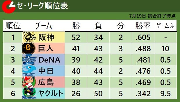 【セ・リーグ順位表】中日が5年ぶり7連勝で4位浮上 2位から5位まで4チームが“1.5差”にひしめく 首位阪神が2位巨人に10差つけ独走|日テレNEWS NNN  日テレNEWS NNN【荒木雅博の目】DeNA・フォードのミス指摘「牧が打球のバウンドに合わせて一歩下がったのは間違っていない」佐野の左翼守備にも言及  中日新聞Web「井上監督救われたね」中日5年ぶり7連勝の裏で…繰り返された手堅すぎる采配に疑問視 レジェンドOBは「芸がない」  Yahoo!ニュース「ピッチャーが安定してきた」…5年ぶり7連勝「中日」好調の要因を「サンモニ」落合博満氏が解説「ある程度打線が固定されてきた」  dメニューニュース中7―2D(19日)/中日が5年ぶりの7連勝  四国新聞