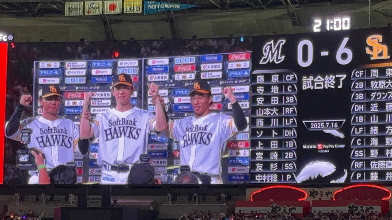 2025.07.16 ホークスvsロッテ 大関好投で勝利! 先発大関が8回無失点9奪三振。 6-0で、快勝! スタメン発表、7回(黄色風船)、どすこい、victory、白風船、ヒーローインタビュー(大関、野村、佐藤)、勝利の花 火 Fukuoka SoftBank Hawks佐藤直樹福岡ソフトバンクホークス NPBHUB.COM | The Fanbase of Nippon Baseball & Nippon Professional Baseball