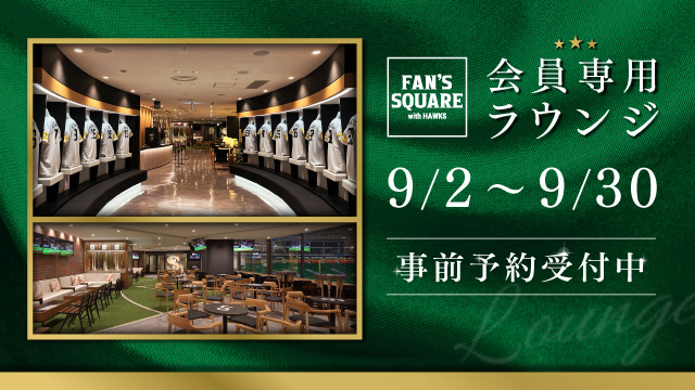 タカポイントでは、9月2日(火)~9月30日(火)にみずほPayPayドームで開催する公式戦における会員専用ラウンジ「FAN’S SQUARE」事前予約の抽選を受付中です。当日の観戦チケットをお持ちのダイヤモンド・プラチナステージ会員様のみお申し込み可能です。