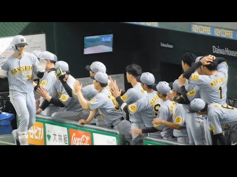 【今年も東京Dで】今季1号の先制ホームランを放ちベンチに迎えられる小幡竜平 歓喜の六甲おろし