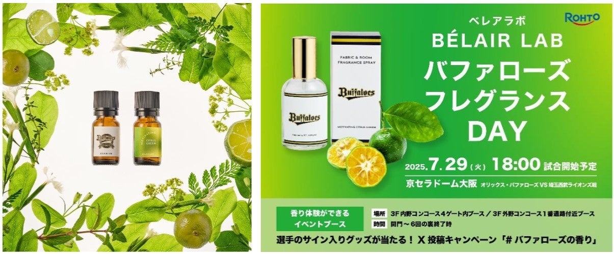 ロート製薬株式会社(本社:大阪市、社長:瀬木英俊)が運営をする「BÉLAIR LAB(ベレアラボ)」は、プロ野球球団オリックス・バファローズ(本社:大阪市)と共同開発し、京セラドーム大阪の選手・チーム関係者エリアで使用中のオリジナルフレグランス「MOTIVATING CITRUS GREEN(モチベーティング シトラスグリーン)」シリーズを、2025 年 7 月22 日(火)よりベレアラボ公式ストア・楽天にて先行発売、7 月 29 日(火)よりベレアラボ公式ストア・楽天・Amazon、および、オリックス・バファローズ球団直営店・公式オンラインストアにて発売いたします。また、発売記念として、京セラドーム大阪にて開催されるオリックス・バファローズ VS 埼玉西武ライオンズ戦を「バファローズ フレグランス DAY」として冠協賛を行い、香り体験イベントやプレゼントキャンペーンを行います。