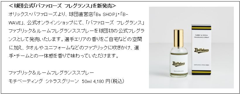 集中力や活気の増加、ストレス・疲労軽減などのコンディショニング向上をコンセプトとした香りは、オリックス・バファローズの選手・チーム関係者エリアで使用され、日々のハイパフォーマンスをサポートしています。