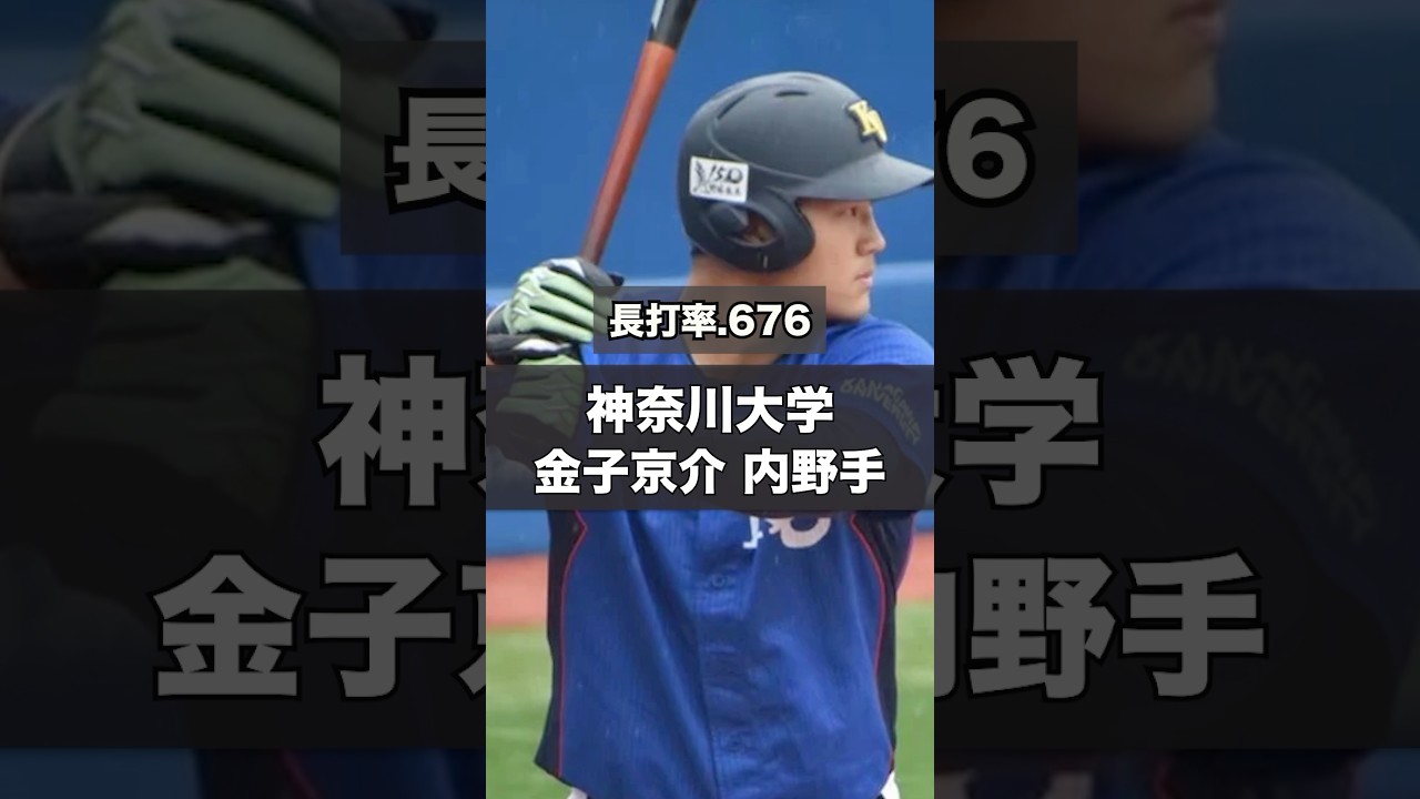 カレ2025神奈川大学の金子京介内野州 2004年1月18日生まれ21歳身長は 185cm体重は105km右投げ右打ち 東京都魂出身で恵まれた対格から繰り出す 打球は通列で強打の一塁です。高校は森岡 大付属高校で2年秋からベンチ入り、 2020年9月22日の仙台北上高校との 準々決勝ではレフトへ上外団2021年の 3年夏の岩手県大会で花巻東との決勝で1 発を含む5戦連発を放ち甲子園でも1回戦 の鹿島学園戦で3アダのモ打賞対応力も あります。神奈川大学へ進学後は2023 年秋のリーグ戦で3本塁打をマーク。4年 生、最後の2025年春のリーグ戦では 10試合で打率2割97輪、4本塁打13 打点と出塁率4割3部5輪、長打率6割 7部分6輪でOPSは1.11。全日本 選手権では近代に破れましたがプロ注目の 大型1塁です。