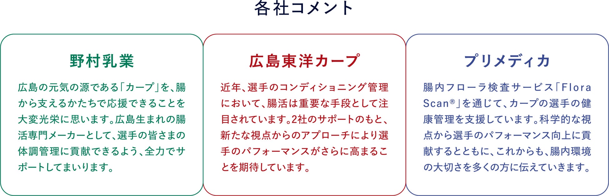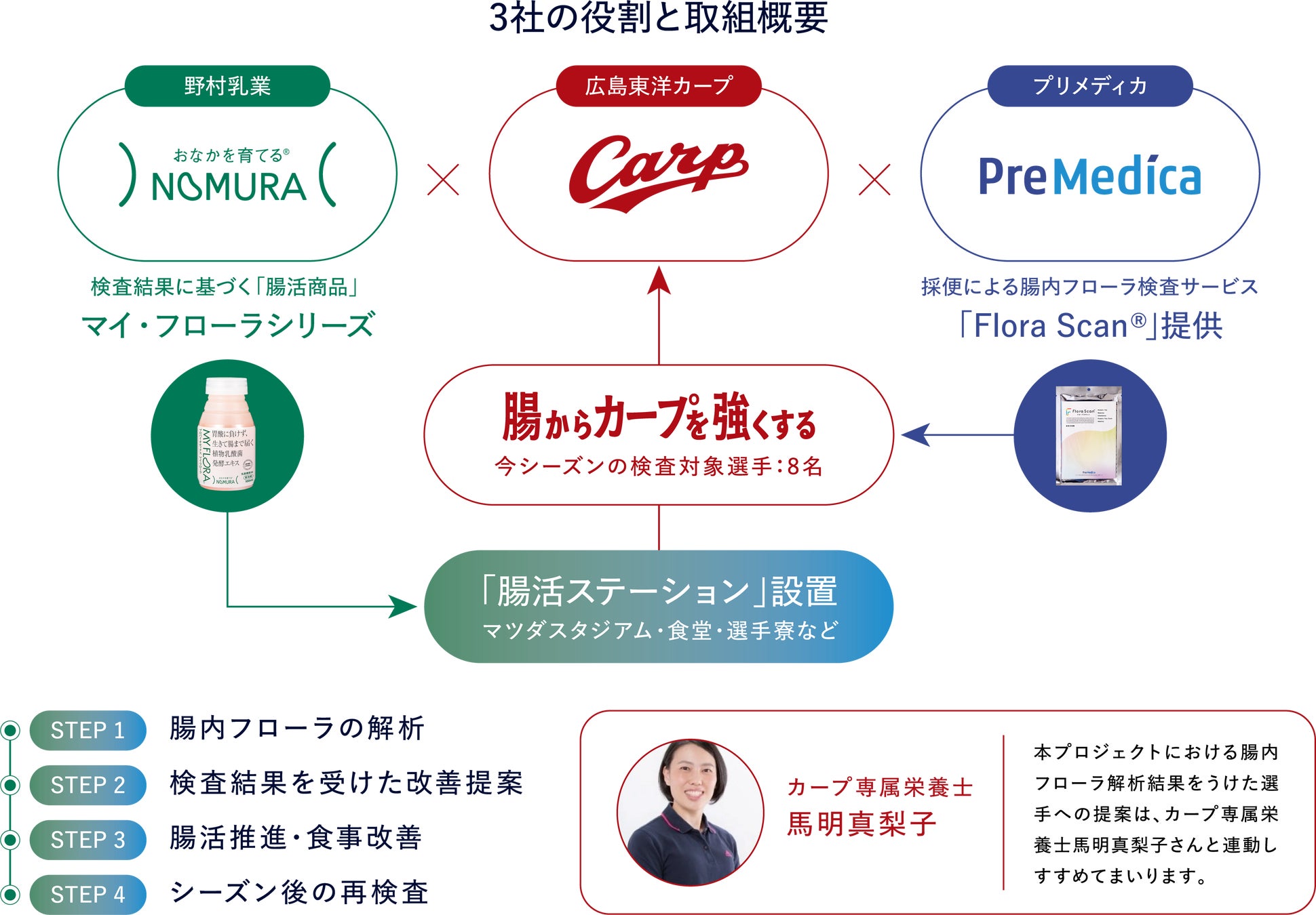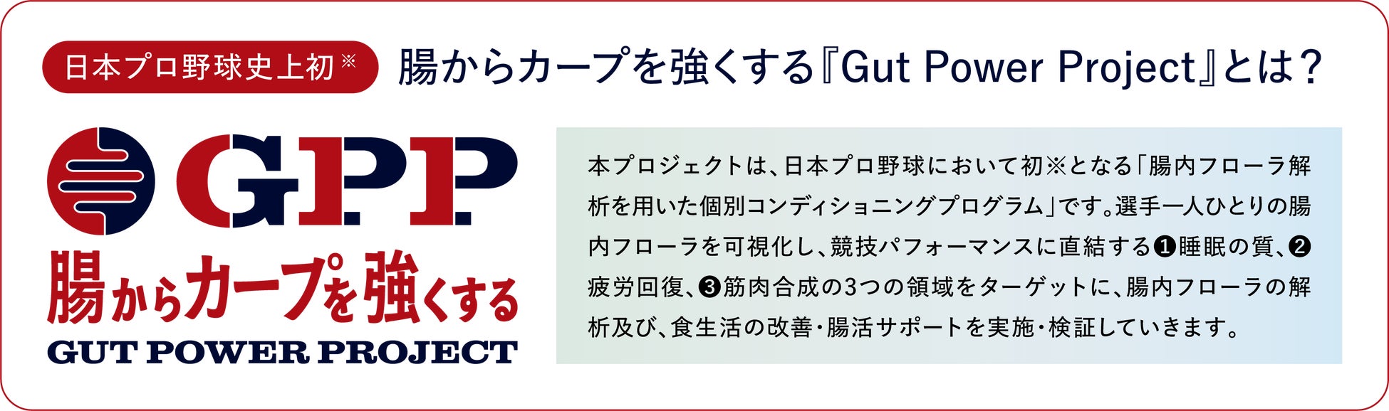 予防医療領域における検査サービスを展開する、株式会社プリメディカ(本社:東京都港区、代表取締役社長 兼 CEO:富永 朋)は、株式会社広島東洋カープ(本社:広島県広島市南区、代表取締役社長:松田 元)と、「おなかを育てる」腸活専門メーカーの野村乳業株式会社(本社:広島県安芸郡府中町、代表取締役:野村 和弘)と、選手の腸内フローラ(腸内細菌叢)を科学的に分析・改善することで、体調管理やパフォーマンス向上をサポートすることを目指す『GUT POWER PROJECT(ガットパワープロジェクト)』の取り組みを開始したことをお知らせいたします。