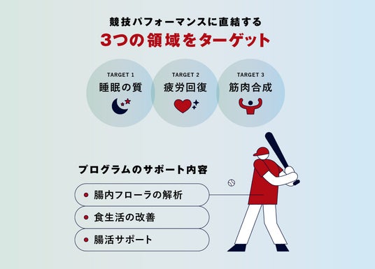 選手一人ひとりの腸内フローラを可視化し、競技パフォーマンスに直結する1.睡眠の質、2.疲労回復、3.筋肉合成の3つの領域をターゲットに、腸内フローラの解析及び、食生活の改善・腸活サポートを実施・検証していきます。