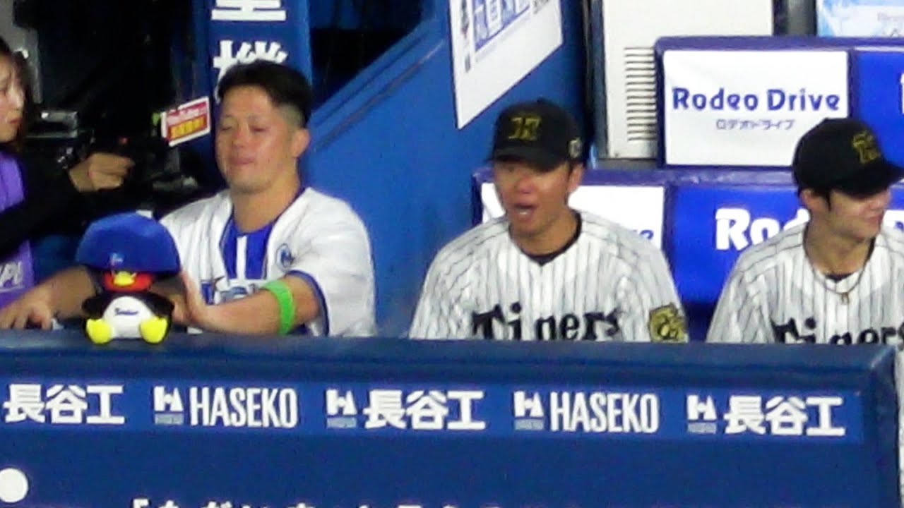 牧秀悟・中野拓夢・村上頌樹がベンチ他チームのキャップの被り合い その後に牧秀悟がチャンテに合わせてノルの現地映像です。