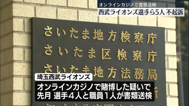 【速報】埼玉・西武ライオンズ外崎修汰選手ら5人を不起訴処分 “オンラインカジノ賭博”で書類送検 さいたま地検 Yahoo!ニュース【速報】埼玉・西武ライオンズ外崎修汰選手ら5人を不起訴処分 “オンラインカジノ賭博”で書類送検 さいたま地検 MSN【速報】埼玉・西武ライオンズ外崎修汰選手ら5人を不起訴処分 “オンラインカジノ賭博”で書類送検 さいたま地検 au Webポータル【速報】オンラインカジノの賭博で書類送検された西武ライオンズの外崎修汰選手ら5人を不起訴処分 さいたま地検 dメニューニュース賭博疑い 西武選手ら5人を不起訴 Yahoo!ニュース西武選手ら5人を不起訴処分 オンラインカジノ賭博容疑で書類送検 さいたま地検(テレビ朝日系(ANN)) Yahoo!ニュース【西武】オンカジ問題で外崎修汰、長谷川信哉ら5人を不起訴処分 au Webポータル【速報】オンラインカジノの賭博で書類送検された西武ライオンズの外崎修汰選手ら5人を不起訴処分 さいたま地検 MSN