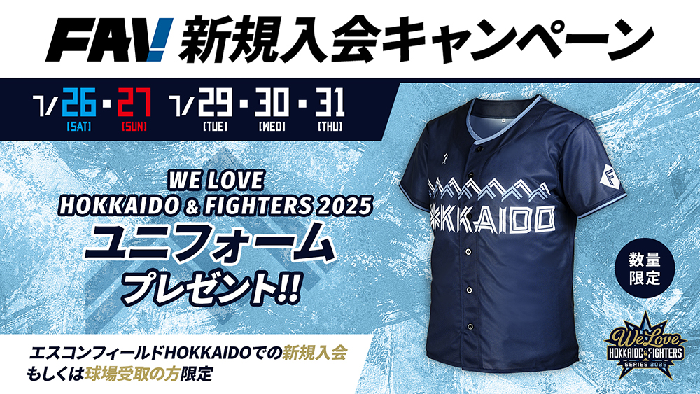 オフィシャルファンクラブFAVでは、7月26日(土)から行われる《WE LOVE HOKKAIDO & FIGHTERS SERIES 2025》の5試合で、新規入会キャンペーンを開催いたします。