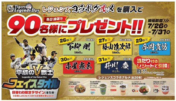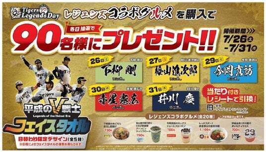 阪神電気鉄道株式会社(本社:大阪市福島区、社長:久須勇介)が運営する阪神甲子園球場は、7月26日(土)対横浜DeNAベイスターズ戦~31日(木)対広島東洋カープ戦において、阪神甲子園球場内売店・ワゴンで「タイガース レジェンズコラボグルメ」をご購入いただいた方の中から各日抽選で90名様(期間合計450名様)に、“平成のV戦士”である下柳剛氏、桧山進次郎氏、今岡真訪氏、赤星憲広氏、井川慶氏の「“平成のV戦士”フェイスタオル」をプレゼントするキャンペーンを開催します!