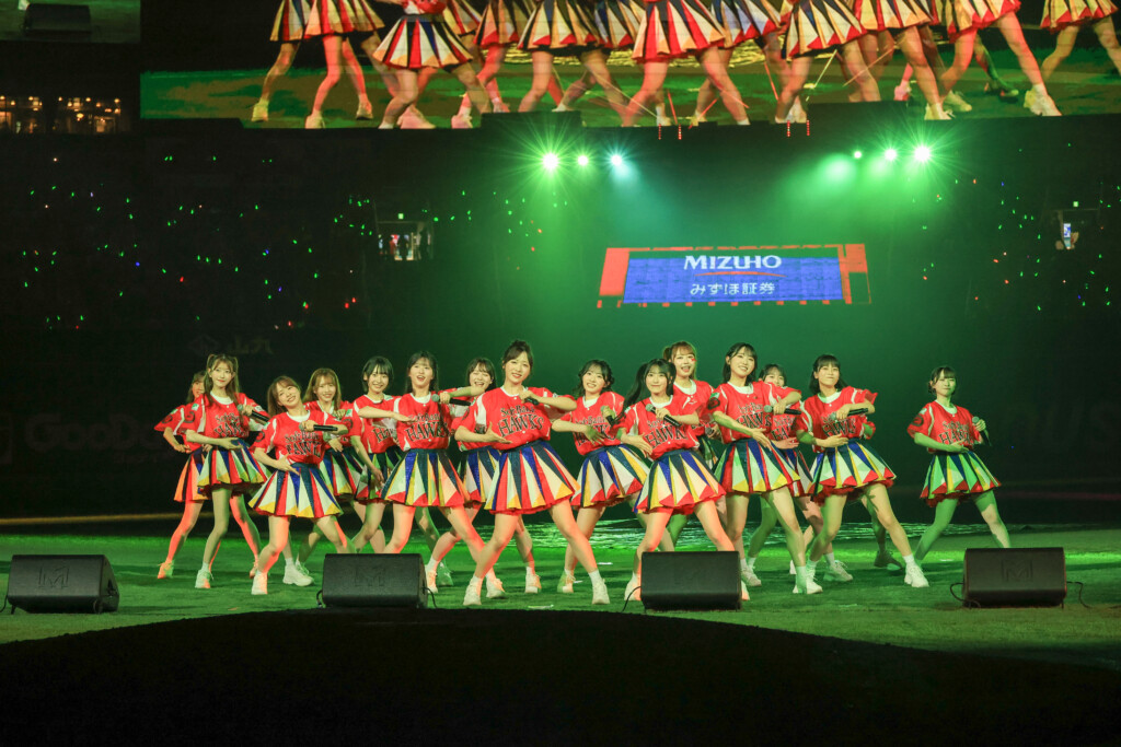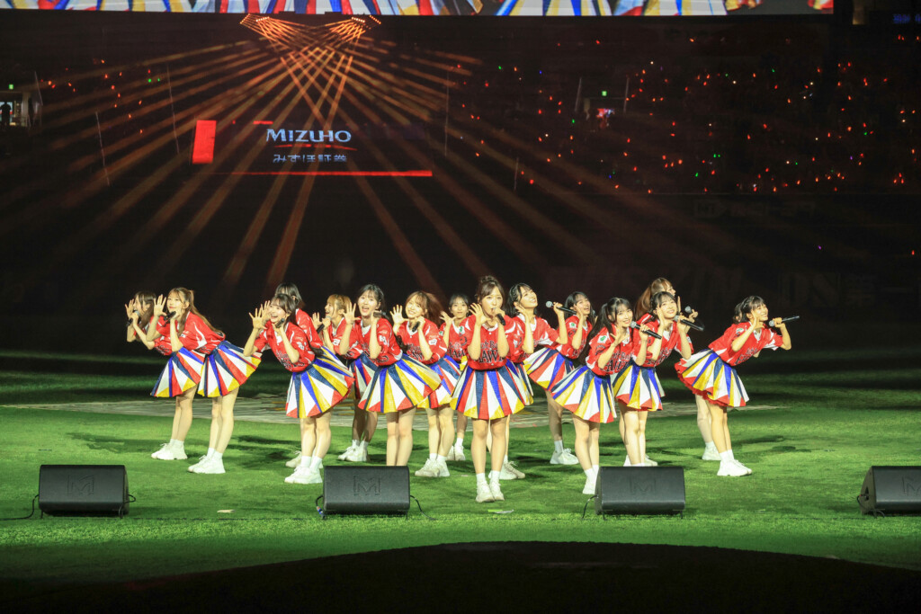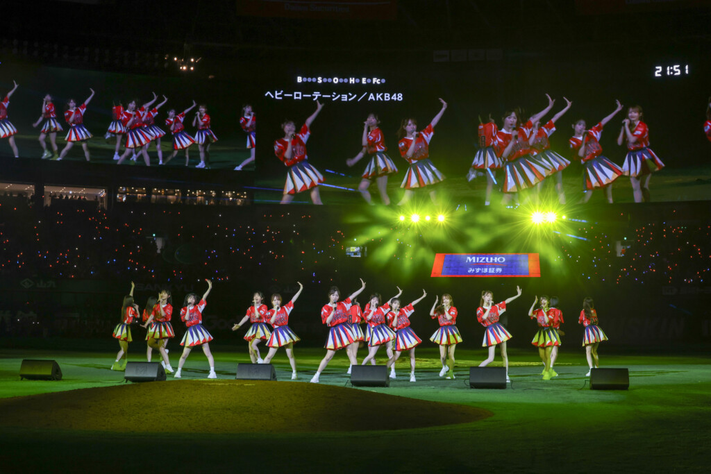 ソフトバンクホークスが見事な逆転劇で11−3と勝利を大勝した後、ソフトバンクホークスと同様今年が20周年イヤーとなるAKB48が登場した。