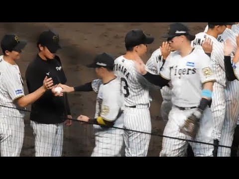 【高橋遥人今季初勝利】近本からウイニングボールを受け取る高橋遥人 阪神 勝利のハイタッチ