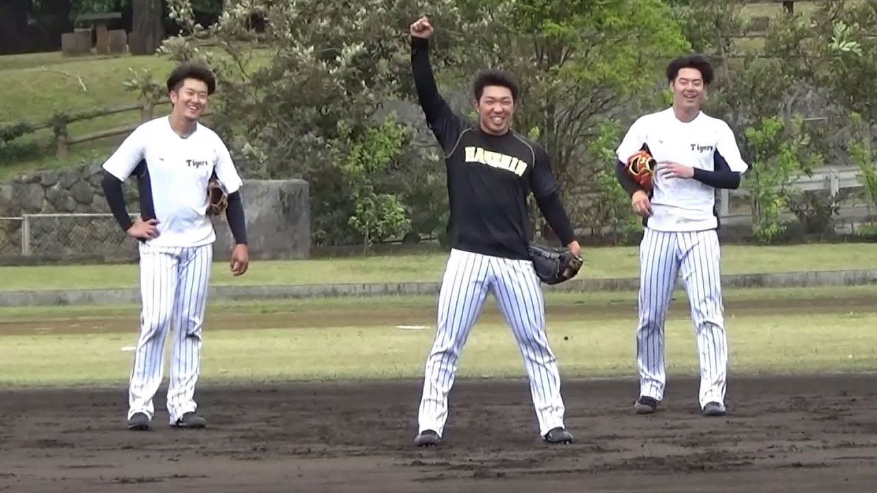 岩貞選手、石井選手、鈴木選手が、福原コーチによるゴロ捕練習に参加。