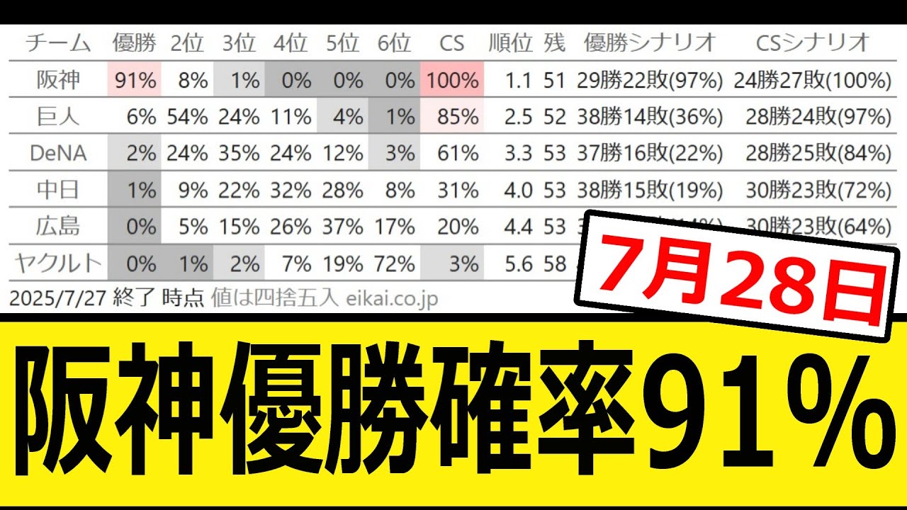 阪神優勝確率91%【プロ野球、なんj、反応集】【野球、2ch、まとめ】【セ・リーグ順位表】