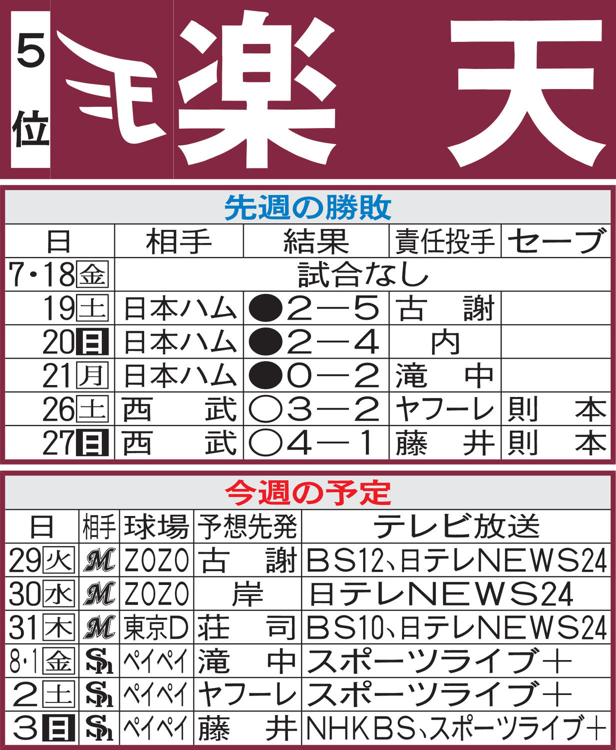 【楽天】先週のMVP&今週の展望 荘司康誠は近日中1軍登板へ(日刊スポーツ)  Yahoo!ニュース東北楽天 荘司が1軍合流「ここから全部勝つ」  河北新報オンライン楽天・荘司 31日ロッテ戦先発で復帰見込み 三木監督「自分のためにやればいい。それがチームのために」  スポニチ Sponichi Annex【楽天】「バッテリーがカギになる」三木肇監督が“反攻”へ意欲 荘司康誠は来週にも復帰  au Webポータル【楽天】三木肇監督、後半戦のキーポイントに「バッテリー」を挙げる 26日から本拠西武戦(日刊スポーツ)  Yahoo!ニュース