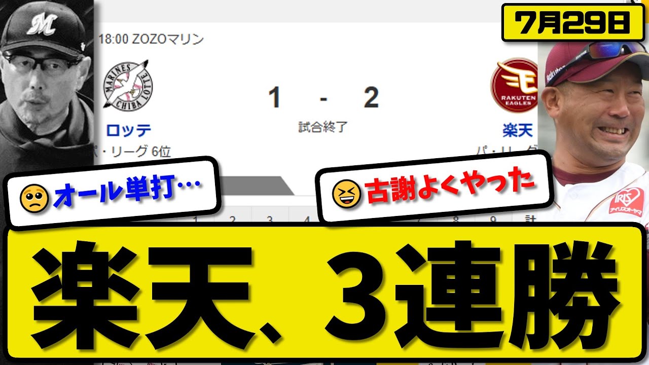 【パ5位vs6位】楽天イーグルスがロッテマリーンズに2-1で勝利…7月29日3連勝…先発古謝6.2回1失点…辰己&鈴木が活躍【最新・反応集・なんJ・2ch】プロ野球