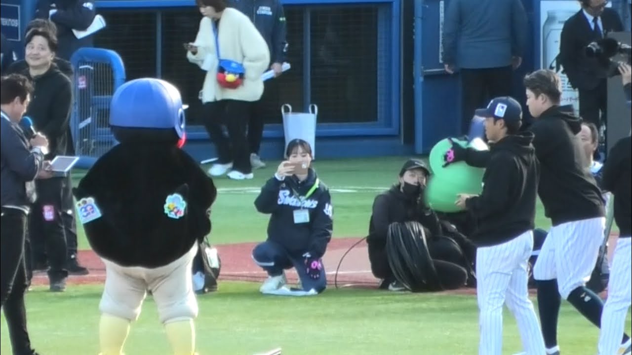 [音楽] ベンチ前かなり盛ってますけもさあ フィールはですねこれから リパ対決行っていき ますさ中回のねしとえの ファンカのえコーナーになりましたえ こちらには30周年のえシーズンを迎え ました東京サズマスコットバロに来て いただきまし たよろしくお願いしますえ今年は空中 クリパも連勝71敗とえいうことで シーズンを終えたわけなんですけれも本当 に難しいですねはね本日は選手の皆さんに つのヘルメットでチャレンジしていただき ますそれではチャレンジしていただく選手 をご紹介しましょうまず投手チーム石山 選手小川 選手高選手小選手そして山野選手 です続いて野チームです潮小手 田選手そして小太郎選手 ですさあ皆さんの空中クリパを見れるあ すごいチャンスだと思いますので皆さんえ くださいねそれではまず本お手を見して いただきたいと思います先生よろしくお 願いし ます選手すいませんね持っていただいて 良かったら書いて くださいはいつもう2歩3歩前にいいて はいそれではつの空中クルリ行きますさあ ファンの皆さん手拍子いいリズム作って いきましょうはいはいっと大きなましょう 3塁 塁ライトスタンドレフトスタンの皆さんル の皆さん一緒 [拍手] にさあ の成功する かなんか後ろから結構流された感じだった んですけどもねえっとVTR見てみますか はいVTR見てみましょうこの絵すごい ですねみんなで見守ってる空中クーパ サイドから もでもいいいい感じだったんですけどね 若干え風で流されてしまったということ ですけども非常に難度高い空中クリパです がえ小川投手はですね先発でえ5回6回の 魔に行く前にですねあのブルペンの前あの ベンチの前で東急練習していますけど サバロの口のクパ目の前で見てどんな感じ なんです かあの邪魔しないようにいつもキャッチ ホールしてますはいこう東京レジ死ぬん ですけどもやはりこう見たりとかされる わけですそうですね見ながら風計算してる のかなとか 考えてますこは投身ももちろんチャレンジ していただきますからねよろしくお願いし ます ますさあそれではですねこの対決は東州 チーム野チーム交互に年齢の若い順に行っ ていただきますえまずは投手チーム山野 投手からの挑戦となります分だったさあ それでは前の方に来ていただい てつなんかこれうまくやるこちとかあっ たりするんですかねあらなんか大丈夫です かあそうですねはいそれでは一気に行き ましょうそれでは皆さん先ほどのいい 手押しでリズムを作っていきましょう山野 太地投手の空中クリパデシレッツ [拍手] ゴーすげえな 山山コメト 頑張ったっありがとうございました続いて 野太郎手あちょっと待ってください リVTRが出てますはいちょっと体が あまりうまく使えませんでしたねちょっと 難しいですねはいじゃあ続いては野の太郎 手ですちょっと真ん中の方に来ていいて こちらの方 はいれさあ手行きましょう村選手から絶対 成功しろよというエルも届きましたさあ 拍結難しいなこれちょっと変な空気が ちょっとVTRで見てみましょう はい感難しいですねはいていきましょう手 チーム小沢手です行きましょう さあ行き ましょう たそれでは VTRリプレ見 てん感じですかね結 今てましたけれど ももうあと3回転くれたいい感じでしたね ナイスでしたさあ続いては浜田選手お願い しますさあみんなで手行き ましょうおい回 [音楽] ださのレジ高ですさあリプレイ 検証前におじした感じですポ入ったった ですけどねさあなかなか皆さんってます けども高手さあ先行しちゃってください皆 さん手行き ましょうさあ行きますよちょっと体うまく 使うていうのもつつかもしれません来た よしうわ見てからこの両手のアクションは 最高でした けどちょっとさそれではもう一度ちょっと リプレイ検証です村選手え行く前にですね ちょっとお待ちくださいこれ体の使い方 良かったですねあの手のポーズも めちゃめちゃ良かったと思いますけれども それではここまでつあの皆さんの チャレンジを見てどうどういった感想を 持ってるのか聞かせてもらいたいと思い ますシ選手被ってですけどねはいどうです か103万103万のカ全然関係ない ですデータを入れてまいりましたはいと いうことでありがとうございますさあ続い て村村選手の挑戦ですさあ村上選手今まで 銃を見てま参考になってると思いますけど 行けそうですかでもいつもつ成功しないん でもうほぼ成功ですみんな失敗してるんで はいあんま面白くないですすいませんでし たが見の決いきたいと思いますさあ皆さん 中宗選手の チャレンジおこのポージングがいい ぞおわ上りすぎた ナストいや結構今これもね風ですごい流さ れてるんですよねす流された おっと両手を広げたポーズは最高に良かっ たですかっこよかったですありがとう ございます厳しいラ小川手のチャレンジ さあボミンされましたさあ行きましょう 小川手の チャレンジ 決め決めろ決めて くれあ長い技 の でありがとうございますばりで