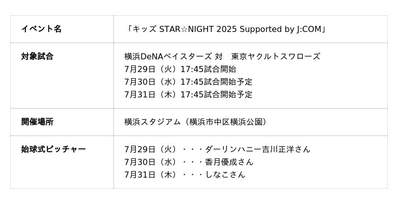 横浜DeNAベイスターズのオフィシャルスポンサーである株式会社ジェイコム湘南・神奈川(所在地:神奈川県横浜市、代表取締役社長:京克樹)は、2025年7月29日(火)、横浜スタジアムにて「横浜DeNAベイスターズ対東京ヤクルトスワローズ戦」でのスペシャルイベント「キッズ STAR☆NIGHT 2025 Supported by J:COM」を開催しました。