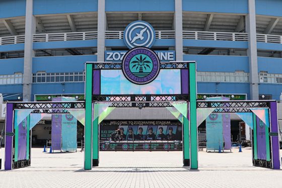今年のイベントのキーカラーは、ZOZOマリンスタジアムから見える海と空をイメージしたターコイズブルーと、近未来的で鮮やかなパープル。球場正面のゲートなどスタジアムの各所が2色に染まり、いつも以上に爽やかな雰囲気に。フォトスポットとして撮影を楽しめる。
