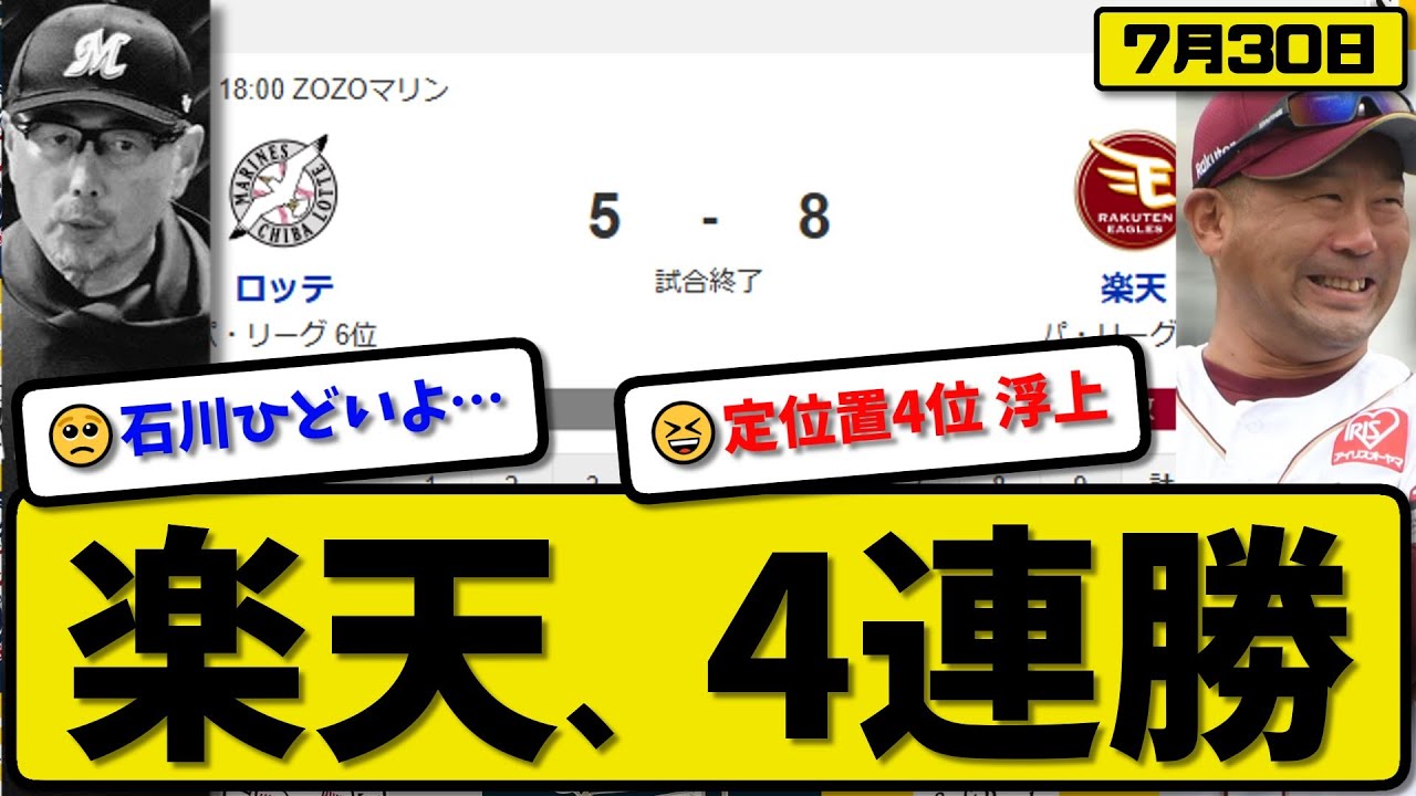 【パ5位vs6位】楽天イーグルスがロッテマリーンズに8-5で勝利…7月30日4連勝…先発岸5.0回2失点…ゴンザレス&黒川&辰己&堀内が活躍【最新・反応集・なんJ・2ch】プロ野球