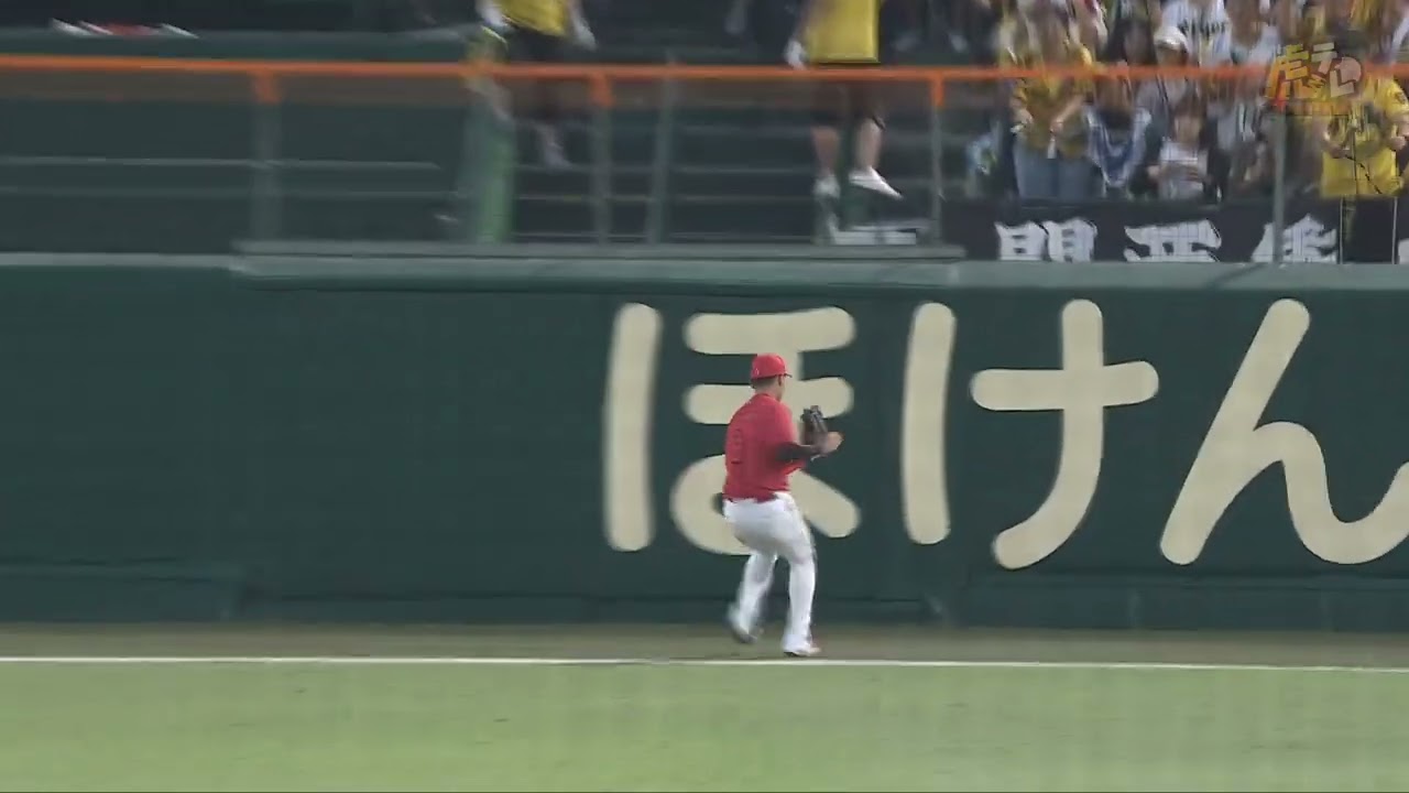 た。しっかり振り切りました。センター 後方だ。下がっていきますがシングル ハンド。この辺りはボールを取りましたが 、この犠牲フライにはもう間違いない。 ホームイン2点目。2塁ランナーの3塁へ 。池山がよくロングランスしてボールを 取りました