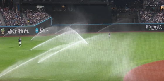 スプリンクラーは約1分間作動し、その後に試合が再開した。この回から登板した生田目は1イニングを無失点に抑えた。このスプリンクラーは、外野の天然芝を管理するために設置されている。