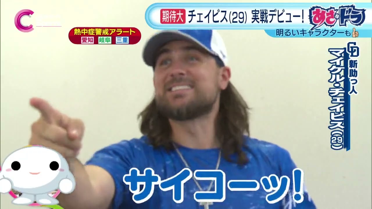 中京TVスポーツ 先週の土曜日です。名古屋球場には多くの人。 もちろん皆さんのお目当ては 新しいチェイピスが今日出るみたいなんで 今日すごく楽しみにしてきました。 やっぱりホームランバカバカ売ってもらいたいし。 はい。この日実践デビューの新外国人マイケルチェイビス選手。 どんな選手かと言いますと入団会見でですね、ダブルピースしちゃうほどチめっけたっぷり [音楽] [笑い] 明るいですね。 そんなチェイビス選手が最近覚えた日本語がありがとうございます。こんにちは。 ちなみに名古屋の町はどうですか? こんな陽気なキャラクターまさにポジティブにぴったり さあ、プレイでも見せてくれました。 てる。 大きな拍手を受けて迎えた来日初打席。 ワンボールからの2球目です。 おお お お。 初スイングでなんとなんとホームラン かと思いきやはわずかにこれファウルという判定になりました。 [音楽] ただこれ球場も大きく湧きました。 その第1打席は空振の三振。 [拍手] 続く第2打席。 [拍手] [音楽] ここはレフトフライ。ノーヒットに終わりましたが、鋭いスイングを見せてくれました。 で、その翌日の試合では初ヒット、初打点を記録するなどその返を見せております。