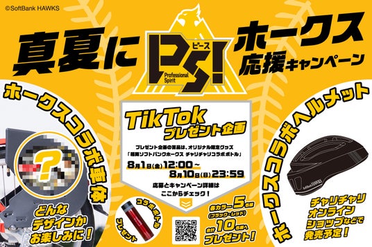 本キャンペーンでは、福岡ソフトバンクホークス仕様のコラボヘルメット・コラボ車体の展開に加え、TikTokでのプレゼント企画(2025年8月1日(金)~8月10日(日))も実施。福岡の夏を福岡ソフトバンクホークスとともに、さらにアツく彩ります。