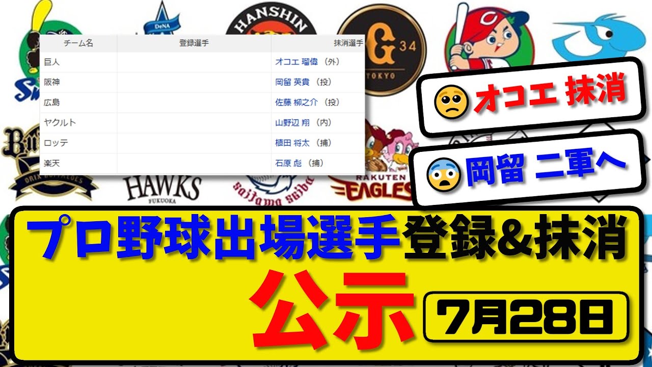 【公示】プロ野球 出場選手登録&抹消 公示7月28日発表|オコエ&岡留&佐藤&山野辺&植田&石原ら抹消|ら登録【最新・まとめ・反応集・なんJ・2ch】