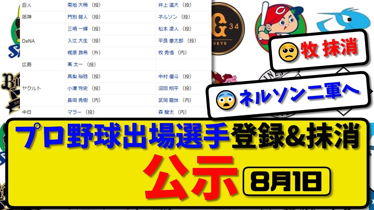 【公示】プロ野球 出場選手登録&抹消 公示8月1日発表|井上&ネルソン&松本&平良&牧&中村&沼田&武岡&森&木村&宮西&渡辺&寺西ら抹消|菊地&門別&三嶋&入江&梶原&小澤&長岡ら登録【最新】