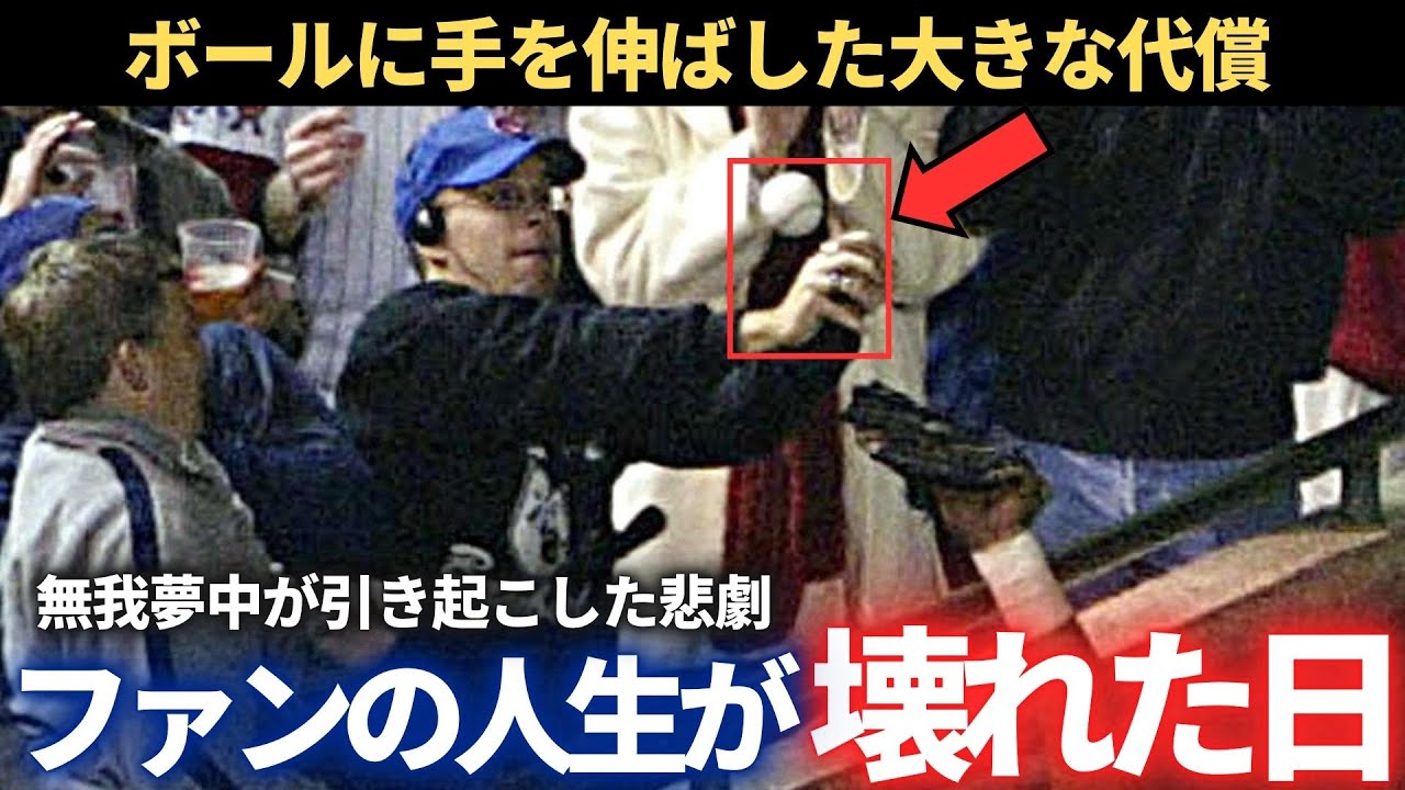 メジャーリーグファンもプロ野球ファンも 長いオフシーズンを絶え抜き大好きな チームのパフォーマンスに一気一する今日 この頃テレビでまったり試合を見る人も いれば球場に足を運んでビールを片手に 野球を楽しむ人もいるでしょうさああなた は運良くフィールドに近い最前列の チケットを買うことができあなたの目の前 にフライボールが飛んできました自分の席 にボールが届くかはかなり微妙なところ その時あなたは少し無理をしてでもその ボールを取りに行きますかもしそのボール が愛するチームの敗北を招くだけでなく 自分の個人情報が特定され住所が公表され 自分や愛する家族がボートから襲撃される リスクを払んでいるとしてもあなたはその ボールを掴みに行くでしょうか球場 アナウンスなどでボールを追いかけないで と警告されることが度々ありますがもし 本当に目の前にボールが近づいてきたら無 が夢中でその警告を忘れてしまうかもしれ ませんでも絶対にボールを追いかけては いけません我々は球場で野球を楽しむ際に は気を引き締めなければならないのです なぜかってその理由がよく分かる事件を皆 さんにご紹介しましょう今回は2003年 カブスに起きた悲劇スティーブバートマン 事件について解説したいと思いますなお この動画は単独でも十分理解できるよう 構成していますがすでにあげている シカゴスの解説を見るとなぜここまで事態 が深刻になったのかがより深く理解でき ますのでよければそちらも合わせてご覧 ください 事件が起きたのは2003年カブスは前年 の2002年に67勝95敗で地区5位に 沈んだことで監督交代となり新シーズン からは同年にジャイアンツをワールド シリーズに導いたダスティベイカーが就任 するとカブスは2003年に下馬表に反し て88勝74敗で1989年以来14年 ぶりの地区優勝を飾ってポストシーズン 進出を果たしますポストシーズン進出自体 も1998年以来5年ぶりと久しぶりの プレーオフでありまたカブスは1945年 にタイガースに破れてから58年間 ワールドシリーズから遠ざかると通称ヤギ の呪いがかかった状況だったことから ワールドシリーズに到達することは球団の 悲願でもありましたそしてNLDSでCス はこの年のレギュラーシーズンで30球団 中最多の101勝記録した競合ブレイブス と対戦このカードはカブスが選するもその 後交互に勝ち星を上げて第5戦までも出れ ましたがNLCS進出をかけた第5戦に 先発したケリーウッドが8回1失点の回答 を披露しケニーロフトンやモイゼスアルー が2ずつ放つなどによって5第1と勝利 989年以来のNLCSにたどり着き ファンのワールドシリーズ進出に対する 期待も当然高まることとなりますそして NLCSではジャイアンツを下してやって きたマーリンズと対戦リグレーフィールド でマーリンズを迎え打つカブスは初戦を8 対9で落としてしまうものの第2戦目を 12対3で解消そして地プロプレイヤー スタジアムに乗り込んでの第3戦目を5対 4で勝利し続く第4戦目も8対3の勝利で 3勝一ぱの大手続く第5戦目は0対4で カ封負けをしますが3勝2敗と大手をかけ ながらファンが大声援を送るリグレー フィールドで残り2試合を戦えることは カブスにとってこの上ないアドバンテージ でしたそして迎えた第6戦カブスは初回 にワンアウトランナー2塁の場面で3番の サミー操作が外の変化球をうまくさばいて 先制のタイムリーヒットを放つと6回には 2アウトランナー3塁の場面で2番手の ドントレルウィリスが通行のワイルド ピッチでカブスが2対0とリードを拡大 さらに7回には2アウトランナー2塁の 場面で2番のマークグルジラネックが センター前へダメ押しのタイムリーヒット を放って3対0と有利に試合を進めると この日カブスの先発を務めたマーク プライヤーは無失点でマーリンズ打線を 片付けていき8回ワンアウトまで無視点の 回答を披露ここまでカブスにこの試合を 落とす要素はほとんど見られませんでした がここからカブスは悪夢のような試合展開 を迎えますマークプライヤーは1番の不安 ピエールに3塁戦を破るヒットを打たれて 2塁にランナーを背負う展開しかしあと アウト5つでワールドシリーズ進出は 変わらずこのまま落ち着いて打車を 打ち取れば問題ありませんバッターは2番 のルイスカスティオマークプライヤーは 初球をゾーン内に決めてストライクを奪い 2球目は外に外れてボール3球目は外の ボールでしたが急心がストライクをコール してカウントワツ4球目はインコースの 変化球が外れてカウント2そして5球目が インハイに外れてフルカウントへ次の マーリンズのバッターはこのNLCSで毎 試合アンダーを記録しているイヴン ロドリゲスのため3点差しかない状況で 出塁を許してイヴンロドリゲスと対戦する のは避けたいシーンですしかしルイス カスティーオも次の6球目をカットして 粘り7球目の即急もなんとかカットして マークプライヤーにプレッシャーをかけ ますそしてついに8球目マークプライヤー は外のボールを叩かせ高く上が