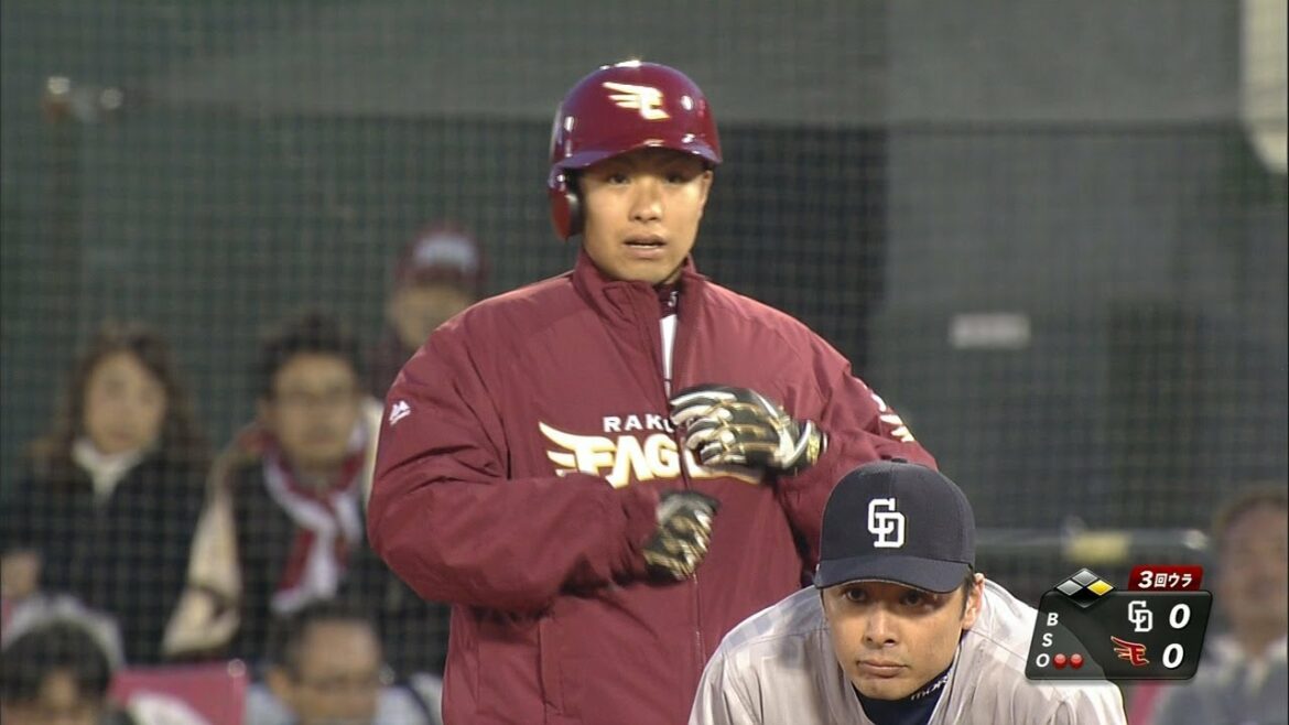 3回、打席には辛島。フルカウントまで粘ると、次に振り抜いた打球で何と外野まで運び、これがプロ初ヒットとなった。打球が詰まって打った時に手が痺れたか?それとも初ヒットの嬉しさか?塁上でジャンパーを受け取ってチャックを閉じる手が、なかなか思うように動かず苦戦する場面が見られた。 (5月23日 楽天-中日)