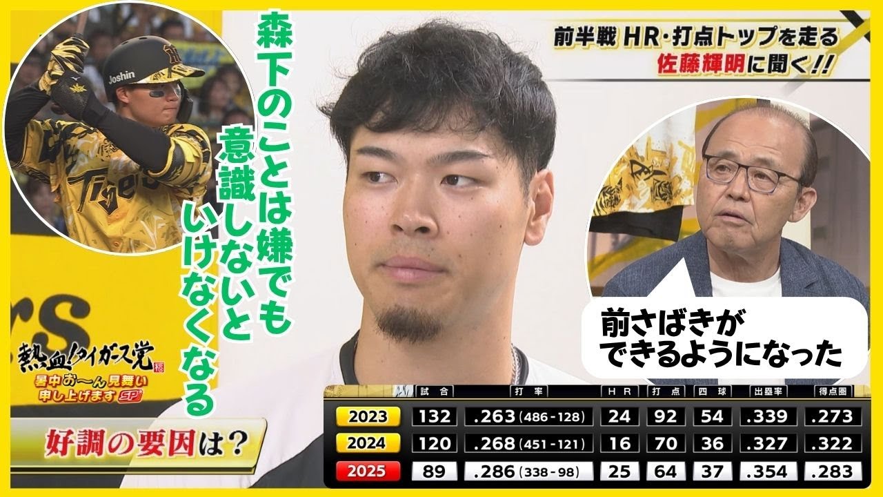 これだけの数字が前半戦で残せている 1番大きな要因どこにあるんですかね? ま、やっぱりこうやってきた技術っていうのが うん。 ま、ちょっとずつこう形になり始めたかなっていう風に思います。 ああ。 何かご自身の中でこれだっていうものを少し掴んだものがあるんですかね? いや、ま、1 つっていうのは難しいですけどやっぱり はい。 うん。体の使い方だったり ああ、 ま、タイミングだったり、ま、いろんな要素ありますけどはい。 ま、1 つは下半身の使い方とかはい。やっぱこう軸足にあんま残らないようにっていうのは今すごい意識してますね。 軸足に残らないっていうことは はい。 軸足は佐藤さんの場合は左足ですよね。 はい。ま、そうです。左じゃなくてこう右でこう回っていけるようにっていうのはすごい意識してます。 それはずっと今まで取り組んでいったことですか? そうですね。やろうとはしてたんですけど、ちょっといまいちこうつめてなくて、 あ、 ま、今年からはちょっといい感じで、え、使えるようになってきたかなと思います。 それはある日突然これだっていうものを掴んだのか? うん。自主トレすかね。今年のやっぱ自主トレで色々こう新しいことも試したりするんで、そこでこう 1つうん。 そこに関しては見つけたことですかね。 力味なくスイングしているっていうことは色々聞くんですけれども、そことの関係ってあるんですか? 力感っていうのはこう上で出ちゃうものだと思うんで、やっぱり下から 順番にこう力をつ使えてるのかなと思います。はい。ま、それ力感なく打てるように見えるっていうのは いいことだとは思います。 前を打つ森下選手。ま、開幕は 後ろ打ってましたけれども はい。 こう、今ホーブランと打点、特に打点ですよね。こうすごく競ってる状態ですけど、ま、その数字っていうのはそんなに意識してないですか? ま、今のところはい。ま、もっと終盤になってくるとね、またこう、えー、嫌でもこう意識しなくちゃいけなくなると思うんではい。 ま、特に今はい。自分から考えるようなことはしてないですけども、 そのチームメイト森下選手とそういうまた今打点をお争らせしてますけど、どういう存在ですか?今 までも本当にいい刺激になってるというかね、彼のこう爆発力、爆発力っていうかね、そういうもの本当にこういいなって僕も思うし、ま、僕に真似できないものは持ってると思うんではい。 へえ。 こ存の集中力っていうかはい。 本当にこう見るからにこうね、本人はあんま意識してないって言ってますけどはい。もうね、チャンスでのバッティングとかはい。違う時があるんで、ま、そういうのは本当すごいなと思いますけどね。 ホームラン打った時に佐藤さんが 2 人でジャンプをしながらハイタッチするあれって何かきっかけがあったんです。 で、打順もこう 34 ってなったんで、まあ、なんかしようかって言ってで、開幕の日ぐらいになんか言って、 どちらか 僕がなんかやろうかて。 あ、そう。 はい。で、1座席目から打てたんではい。 ま、そっからずっとやってますね。 あ、突然佐藤さんが思いついたんですか? うん。 ま、なんか前からずっとなんかやろうかなと思ってたんすけど、も やることもなくでももうなんかね、ラジも変わって、 ま、なんかやるチャンスかなと思ったんで、はい。ま、なんかやってみようかっていう感じではい。 ここまで打った前半戦のホームランで、ま、あえて 1 つ選ぶとすればこのホームランがとても印象に残ってますと。 ま、でも開幕戦のホームランっていうのは本当に、ま、今年はこうね、また新たな自分でこうやっていくぞっていうはい。それが見せれたかなと思うしはい。すごい印象的ですね。 改めてあの藤川新監督の初戦の第 1 座席、あそこでホームランを打ったっていうのはその後どう繋がりました? はい。ま、その後ちょっと調子崩しましたけど、ま、でもこれは行けるぞっていうはい。 自分の中ではなりましたね。 同級生の同い年の村上正期投話を伺かってるんですけど、え、佐藤さんにメッセージが届いておりまして はい。 え、もっとこれからたくさん打ってくださいと。 はい。 分かりました。はい。いい時悪い時もありますけどでもやっぱ安定してるなっていう風には本当に感じてるので、ま、そこでね、野シが頑張ればもっとこう買っていけると思うんではい。もちろんもっと打ちたいなと思ってます。はい。 同じ兵庫県出身ですからね。 はい。 ちらっと記事で見たんですけど、なんかキャンプ中に今年の はい。 兵庫県出身の皆さんで はい。 食事会が佐藤さん、村上さんで本さん、さ木さん、 あとさん の5人ではい。 ちょうど僕うちの番組で去年おっしゃってたんですよ。 なんか誰が感事しましょうかみたいな。だから はい。はい。 なんか番組で企画できたらいいなと思ってたら先にもう皆さんで はい。はい。 やってしまいましたね。 いやいやい。それ全然いいんで