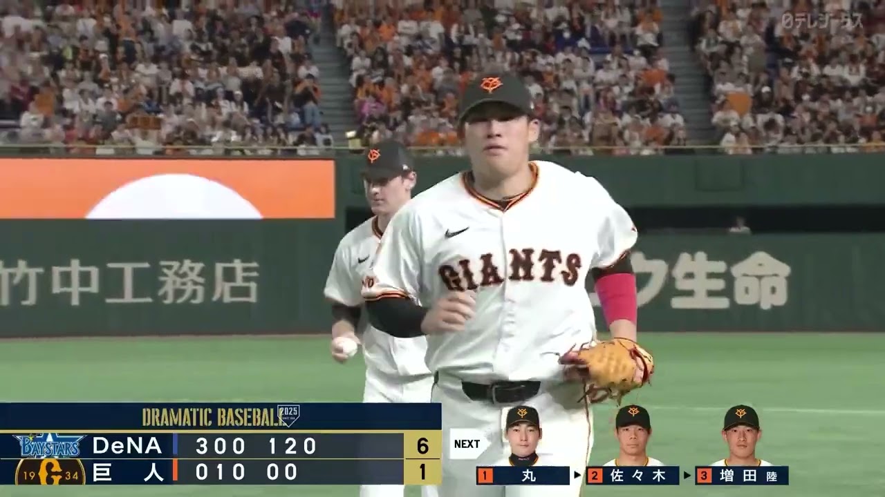 あと1本を打ちますと通算 100号という差でもあります。 12 間増グよく取ったグリフィンがベースカバーしました。まあ、 12 塁間かなり強い当たりでしたからね。ええ、 そうですね。 4番 宮崎うまく取りまして、そしてグリフィン がベースカバーに入っています。 縦に大きく割れるカーブも1つの持ち味 このボールです。12塁間マッサリグよく 取ってケラーがベースカバー。さあ、6 回の表ベースの攻撃終わりまして 6 回の裏ジャイアンツの攻撃は 1番ライトマ 1番ライト12 塁間への強い打球ベースカバーから飛びつい はい。