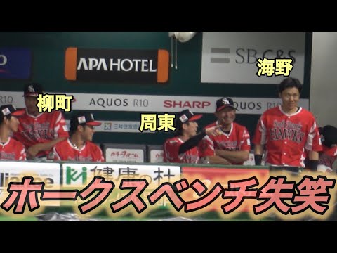 ホークスベンチ🤣周東&柳町爆笑😂試合開始直前🤣「海野選手、ミスなしでキャッチできるように頑張ってください」とまさかのお子様からのメッセージに海野隆司タジタジ🤣鷹祭サマーブースト2025🔥