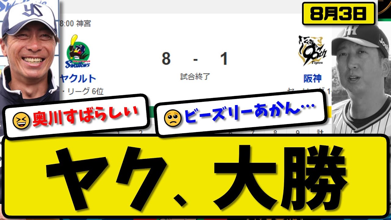 【セ1位vs6位】ヤクルトスワローズが阪神タイガースに8-1で勝利…8月3日大勝…先発奥川7回1失点…オスナ&村上&内山が活躍【最新・反応集・なんJ・2ch】プロ野球