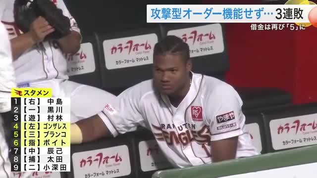 【楽天】助っ人トリオの超攻撃型打線で挑むも3連敗 借金は再び「5」に(仙台放送) – Yahoo!ニュース Yahoo!ニュース【ソフトバンク8/3スタメン】上位打線は入れ替えなし!1番周東~4番山川 5番・サードで前日HRのダウンズ起用 午後1時試合開始 TBS NEWS DIG【楽天】前日のソフトバンク戦で先発5回4失点の藤井聖と3失点の加治屋蓮の登録抹消 日テレNEWS NNN井上朋也が初の左翼 前日3号ソロのダウンズは5番 ソフトバンクの楽天戦スタメン発表 西スポWEB OTTO!楽天 散発3安打で3連敗 3人の外国人を並べた打線機能せず dメニューニュース