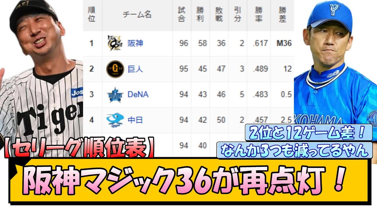 【セリーグ順位表】阪神マジック36が再点灯!