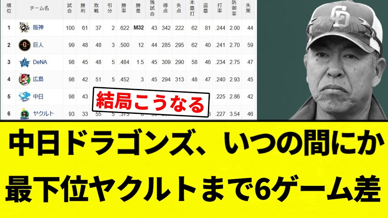 【6666は勘弁】中日ドラゴンズ、いつの間にか最下位ヤクルトまで6ゲーム差【プロ野球反応集】【2chスレ】【なんG】