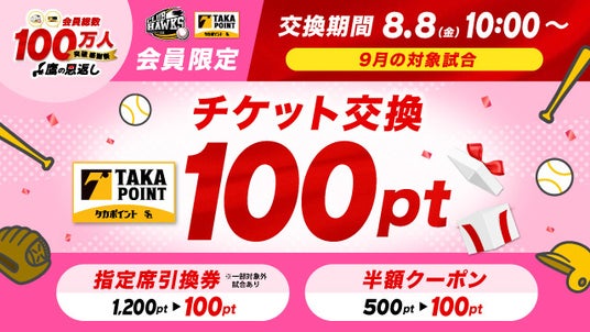 「タカポイント」の交換特典でホークス主催公式戦の対象チケットが100ptで交換できるキャンペーンやBOSS E・ZO FUKUOKAアトラクションが100時間限定で半額になるなど、「100」にかけた様々な特別イベントをクラブホークス・タカポイント会員限定で実施します。