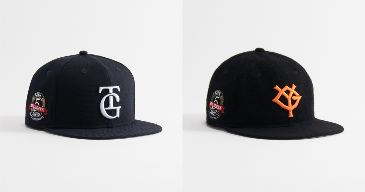 コラボキャップは、2023年に球団創設90周年に際し改めた“TG”ロゴをあしらい、日の丸と“KITH”を合わせた国内限定パッチをあしらう“フィフティーナインフィフティー(59FIFTY)”と、“YG”ロゴやレザーストラップを配し、尾州で仕上げたライトメルトン生地を用いた“ナインフィフティー(9FIFTY)”を販売する。ともに「キス」東京店の5周年を祝したエンブレムを刺しゅうする。