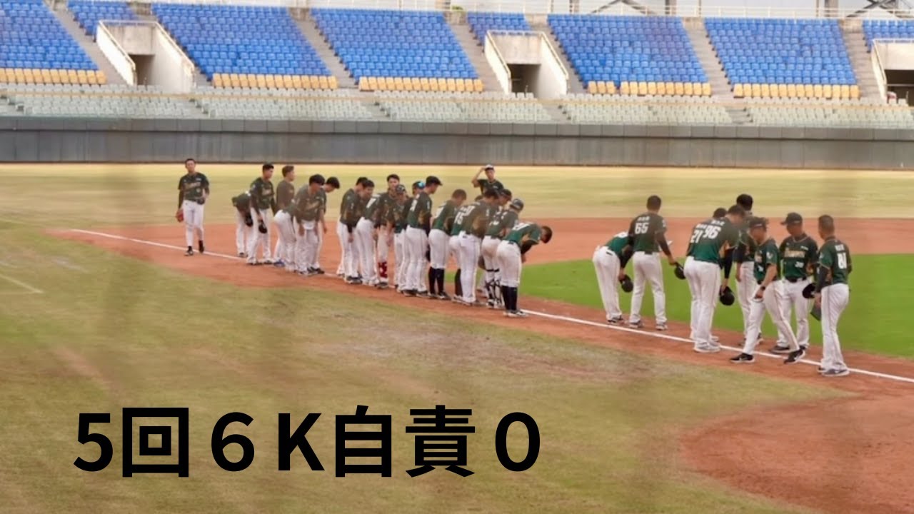 はい、今回も美との試合に登板しました。 え、3試合連続ですかね。はい。え、 ダブル先発であるんですけど、5回、え、 も決まっていたので、 え、結果的には、え、5回で、え、自績は 0だったので良かったと思います。 え、ブルペンであんまり調子が良くなかっ たんですけど、え、投球練習でしっかり 修正することができました。 え、初回の戦闘三振取って、え、2番 バッター、え、ライトフライだったんです けど、太陽が被ぶってしまって、え、 ランナーは3塁にきました。で、記録は ヒットでワンアウト3塁です。 で、ここはピンチだったので、え、慎重に 行きながら左バッターだったので、 曲がり玉で三振取ることができました。 ここで 2アウト目を三振取るなら大きかったなと 思います。 2アウト3塁、え、上位打線になるんです けど、え、まっすぐで、え、ファースト ファールフライで3アウト。ここで点を 取らえなかったのは良かったなと思います 。 そして2回、え、強いだけ打たれるんです けど、え、サードが止めてくれて、え、 ナイスプレで、え、ワンアウト。 で、こうレフトフライ。え、まっすぐです かね。ツアと 全体的に早めのカウントで打ってくれたの で、え、この回は3者本体で、スリアと 取ることができました。 で、3回裏いい形で追い込んで、え、 ピッチャーゴールでワンアウト。 で、ここ9番バッターだったんですけど、 え、まっすぐ打たれてレフトマイヒット でワンアウト1塁になります。 で、ここゲツコースだったんですけど、え 、ショートの早急エラーで 、え、早急が転がってしまって、そのまま 1塁ランナーがホームに帰ってきます。で 、打ったバッターは3塁まで行って、ワン アウトランナー3塁ですね。 で、次のバッターはフォアボールであと1 3塁 でこの統塁はされるんですけど 追い込むことが優先だったので、え、2 ストライクですね。 そしてストレートがギリギリ、え、 ストライク取ってくれて三振。ここも三振 で2アウト目を取れたのは大きかったなと 思います。 で、2アウトランナー23、3塁で 追い込んでカットボールをしっかり三振に 行って、ここハウスインド を、え、ストライク取ってくれてツリ アート。 そして4回裏。え、このバッターには結構 いいだけ打たれてたんですけど、え、高め 中心に攻めてってセンターフライでワン。 そして次のバッターをカットで、え、 空振り三振。え、前回 カットボールがあんまりストライク入って なかったんですけど、この日は、え、いい 感じに取れたので良かったです。 で、2アウトからこれ外も真っすぐですか ね。え、2ベースで2アウト2塁になり ます。ここから買線になっていくので、え 、落ち着いて 対処できたのが良かったです。 ストライク追い込んで、え、フォークです ね。これ空振り三振で3アウトで、三振を 多く取れたのが今回良かったなと思います 。 そして5回裏。 え、これ9番バッターですね。ヒット打た れたバッターですけど、レフトフライで ワンアウト。 で、次のバッターはカットですかね。 これショートフライで2アウト。 そしてセンターマイヒット、え、2アウト ランナー1塁 でこのバッターに対してちょっとセカンド が後ろに下がってこうシフトを敷いていた のでちょっと弱いだけになっちゃってない アンダー でランナーが3塁に済んだので2アウト3 で、ここはレフトフライで3 アウトでここで、え、交代になりました。ま、全体的には良かったかなと思います。 いただ