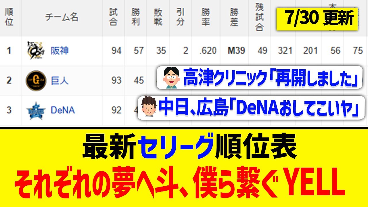【7月31日】最新セリーグ順位表 ~それぞれの夢へ斗、僕ら繋ぐYELL~